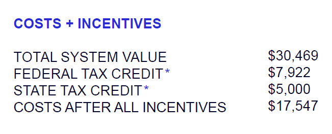 As mentioned previously, systems usually cost between $20,000 and $40,000. Right now is the best time to go solar because of all the incentives and rebates available. Homeowners can receive a 30% federal tax rebate and a $5,000 rebate from New York State, depending on the financing method, and most clients see 50% or more of their system cost covered by these incentives. Check out this client proposal. The total cost of their system was $30, 469. By combining incentives, the price drops to $17,547.