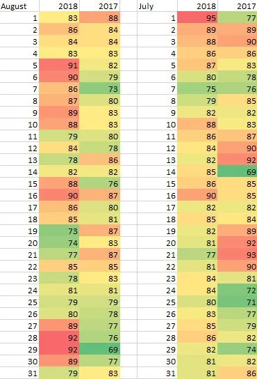 - 2017 August only had 5 days above 85*. 2018 August had 12, with four of them over 90!